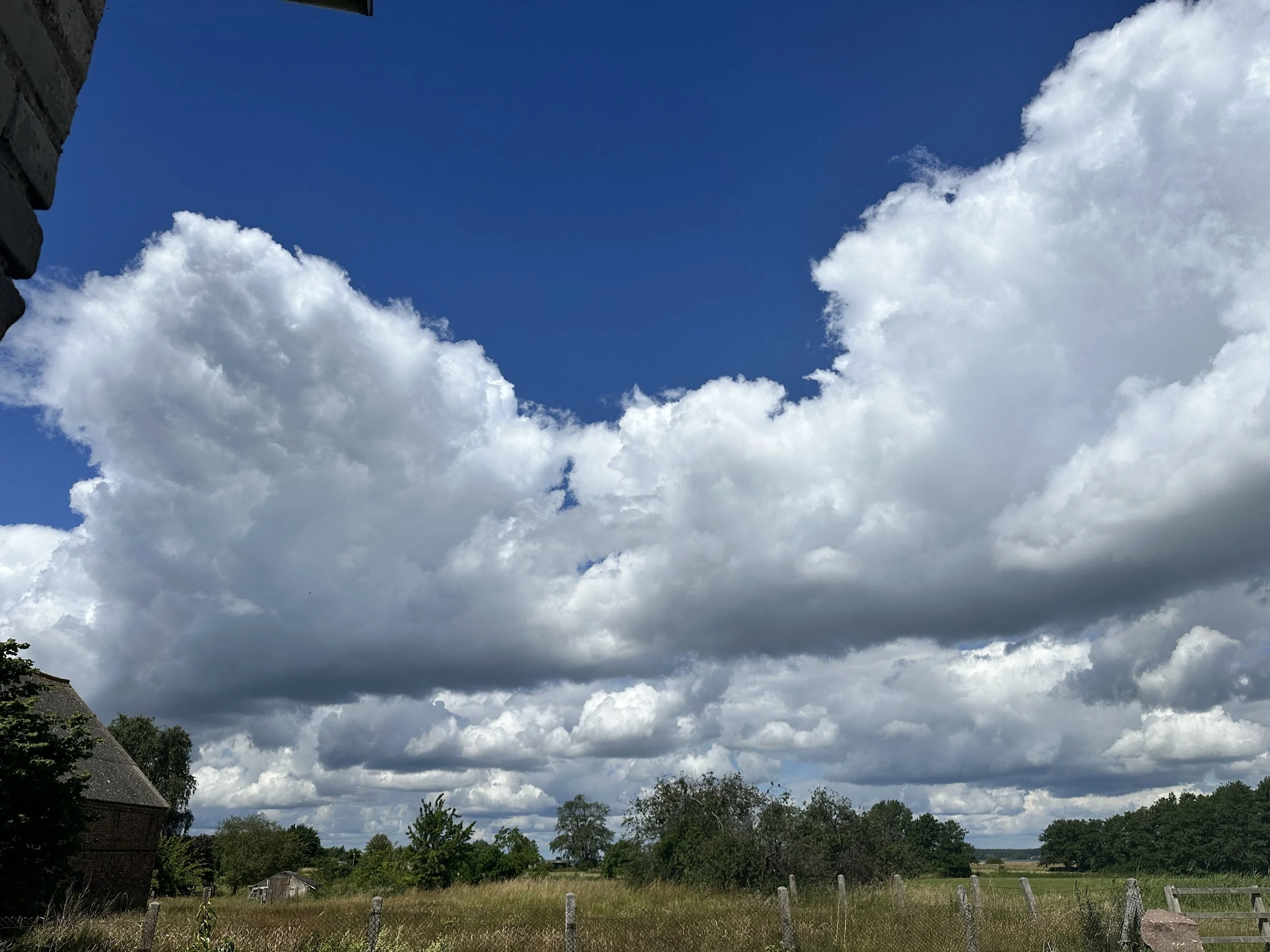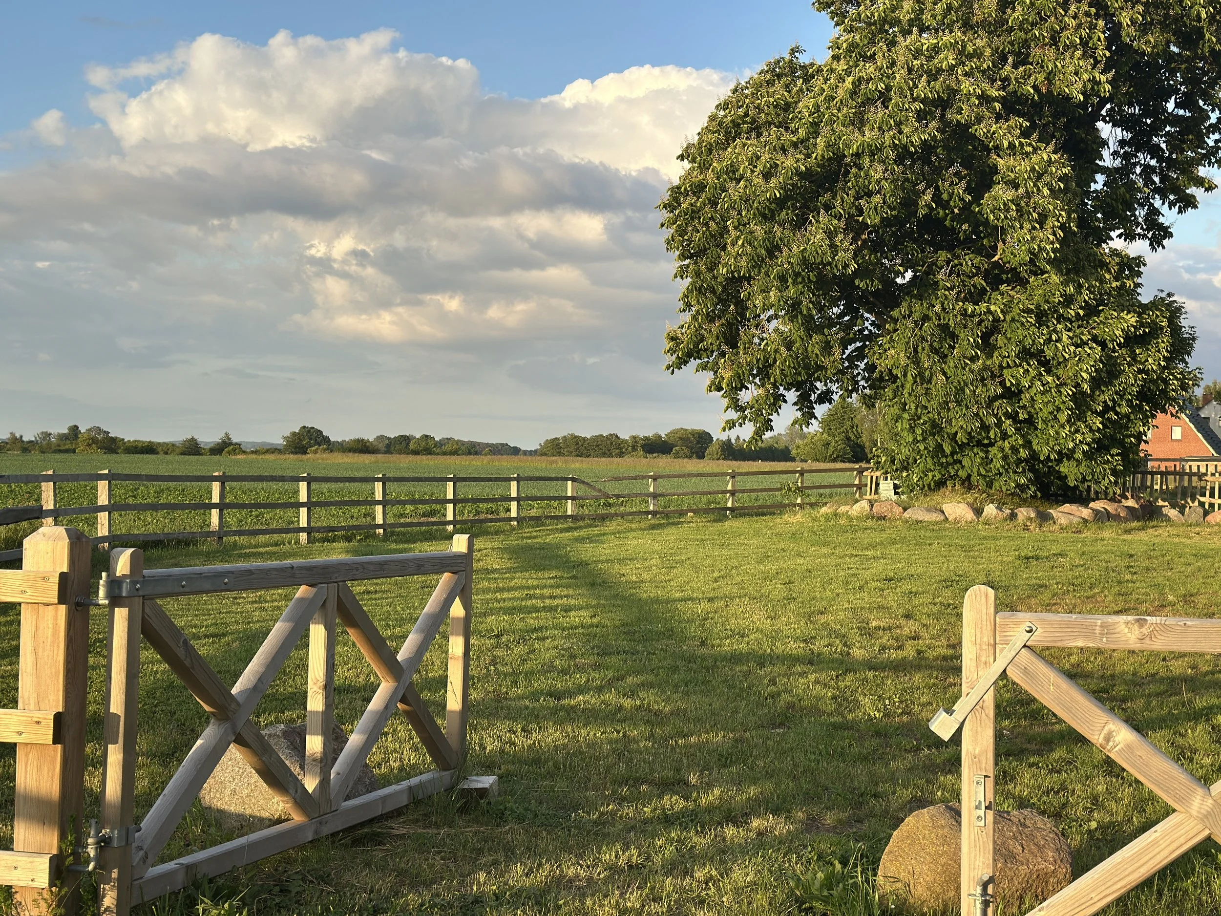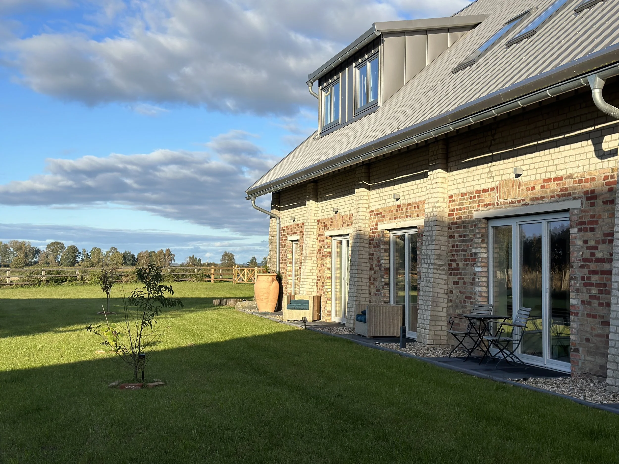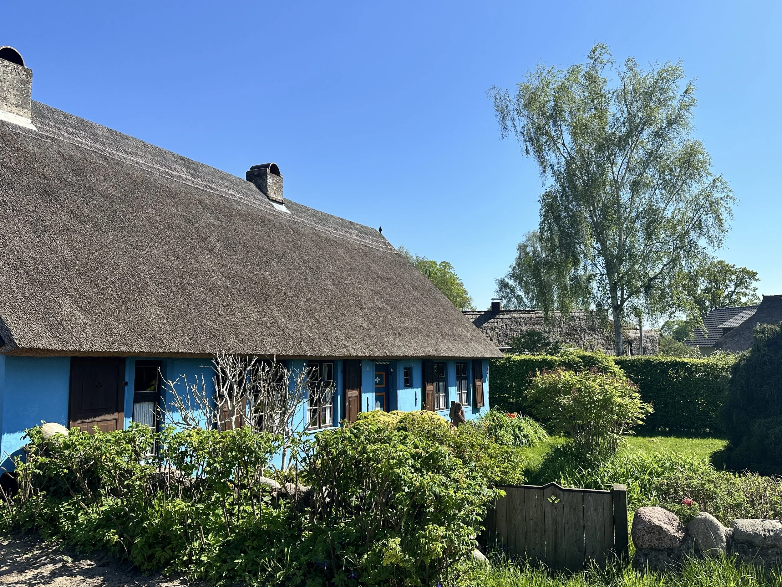 Blaue Haus mit Strohdach, umgeben von Grün und einem großen Baum, unter klarem blauen Himmel.