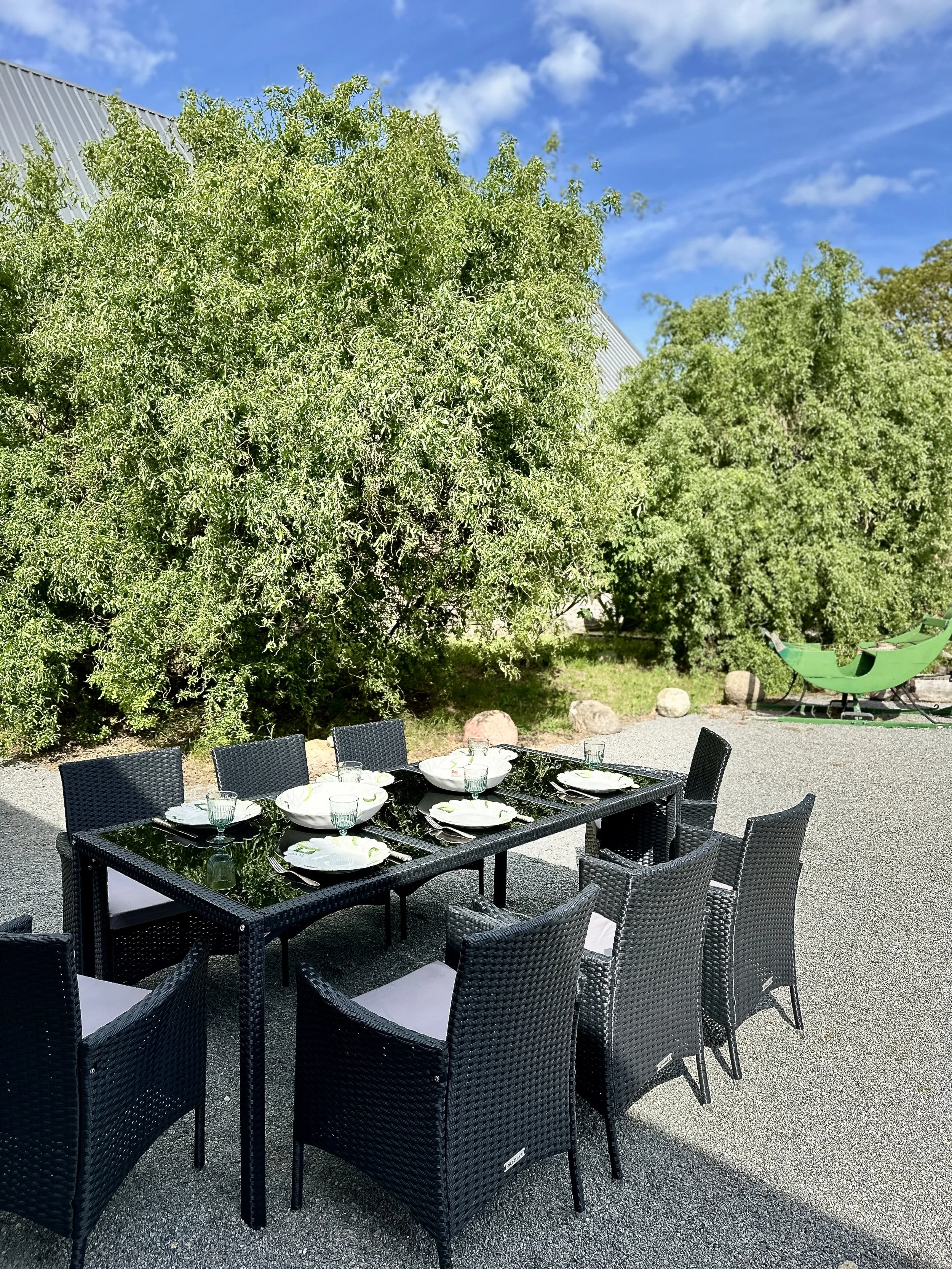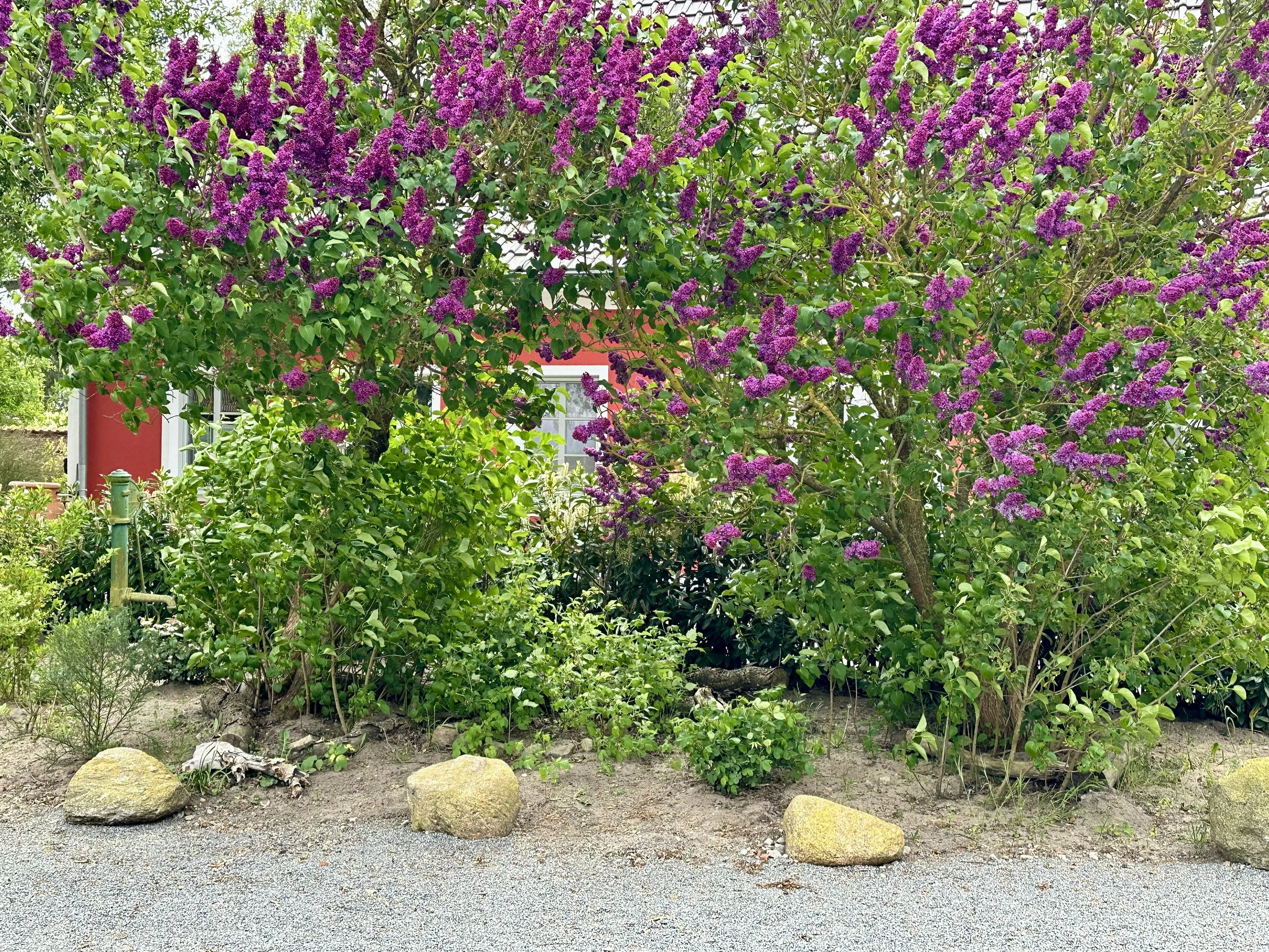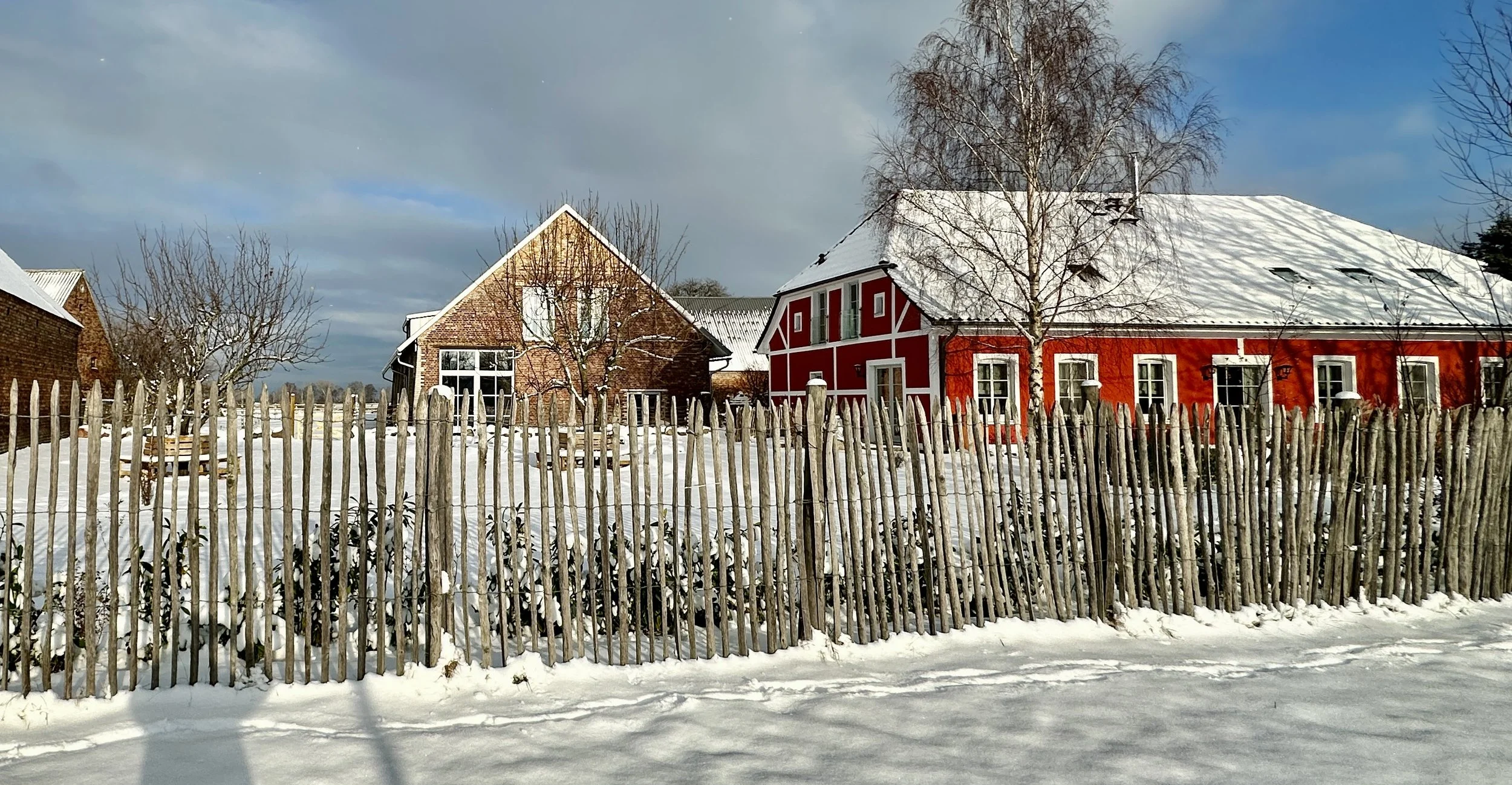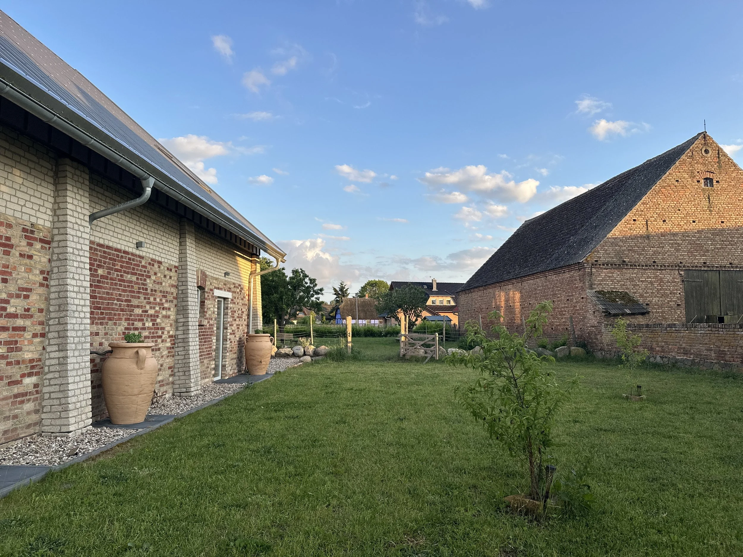 Blaue Haus mit Strohdach, umgeben von Grün und einem großen Baum, unter klarem blauen Himmel.