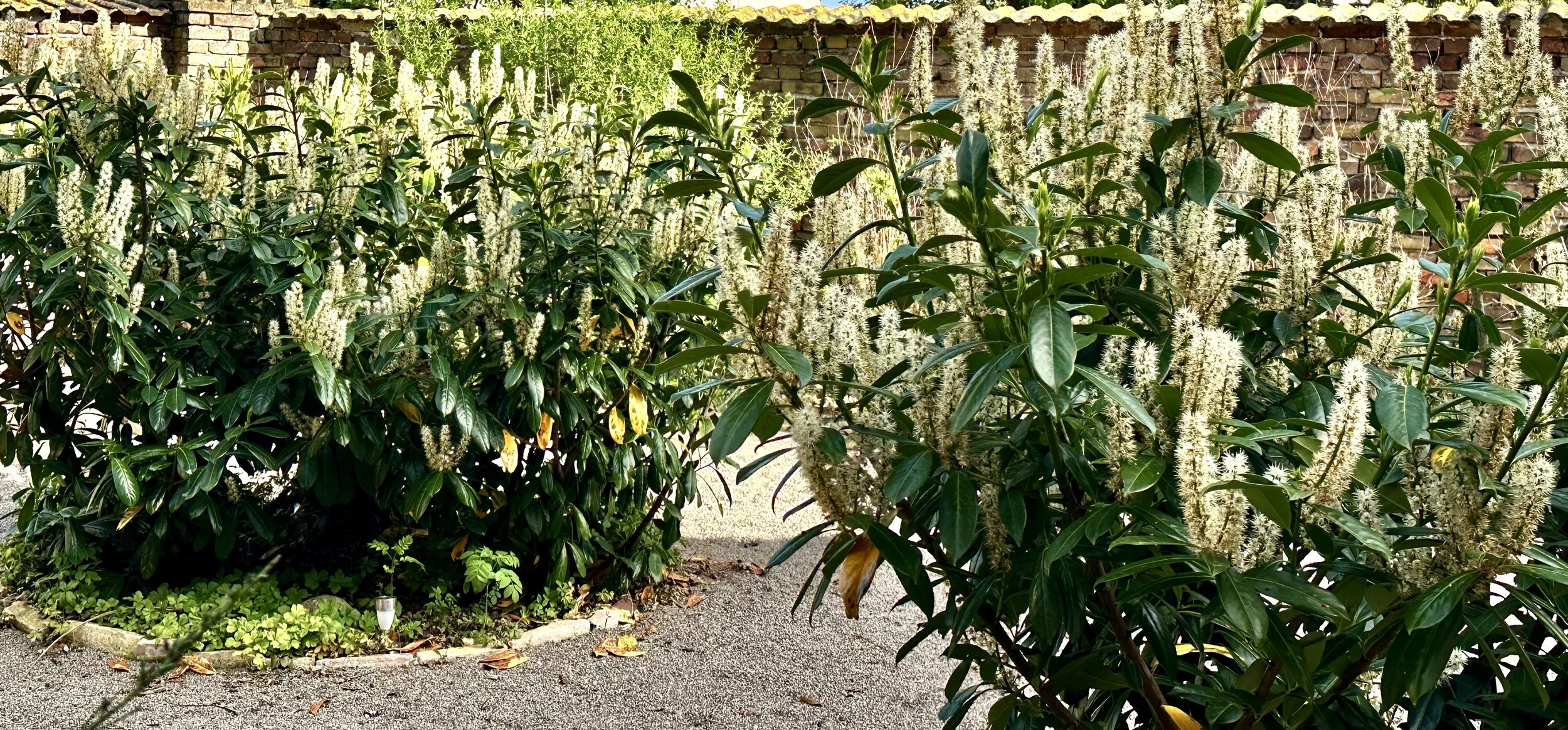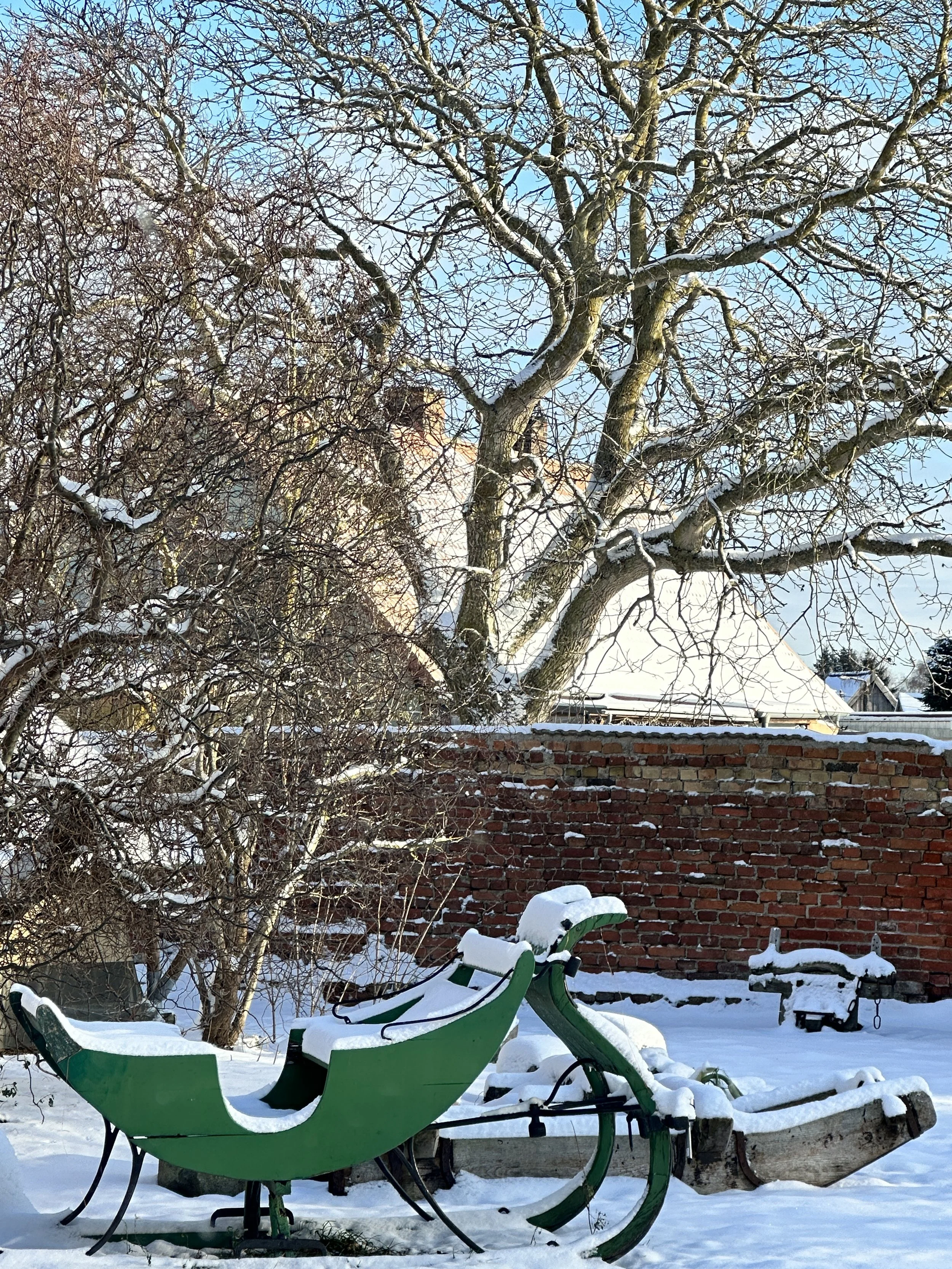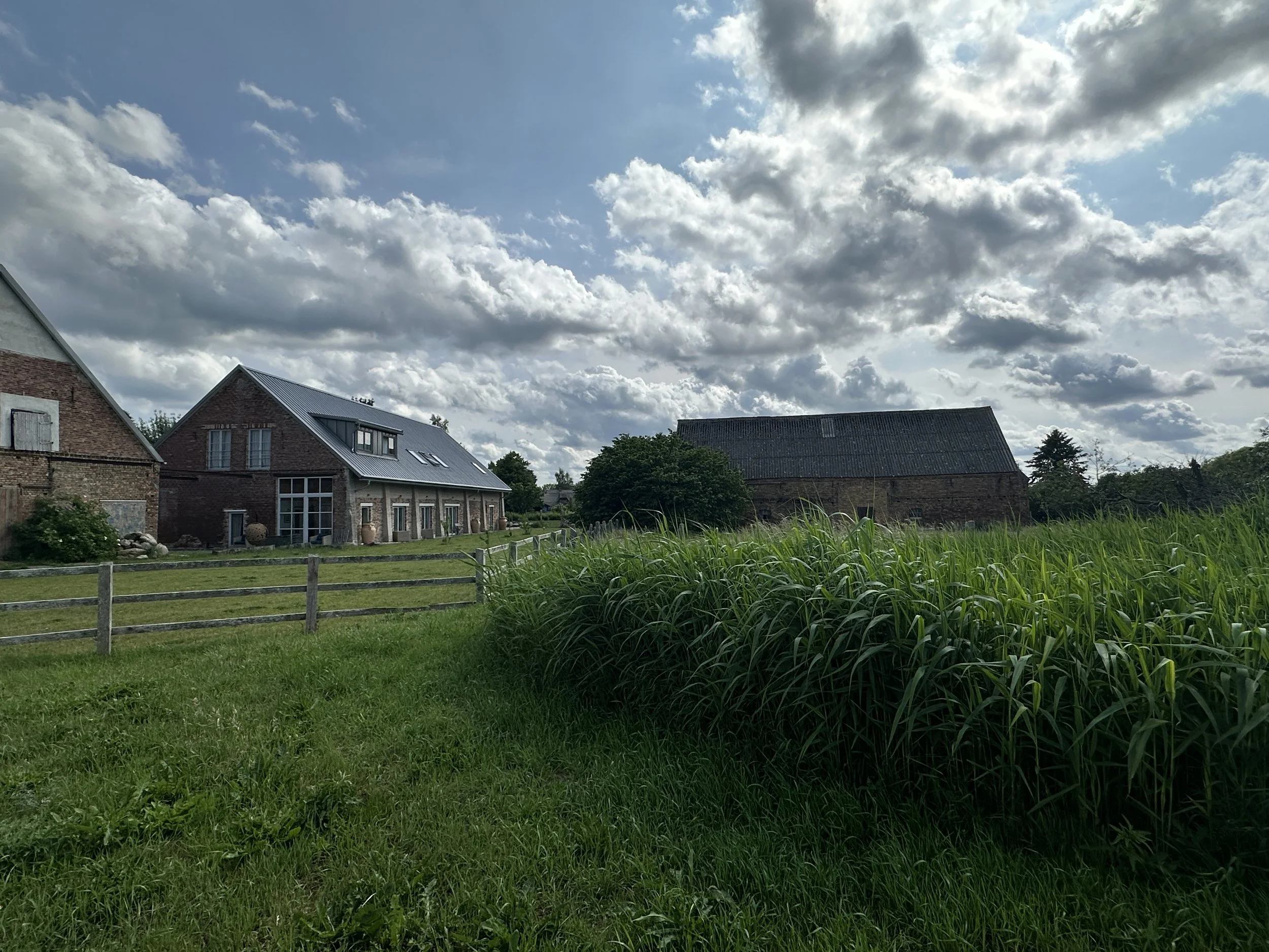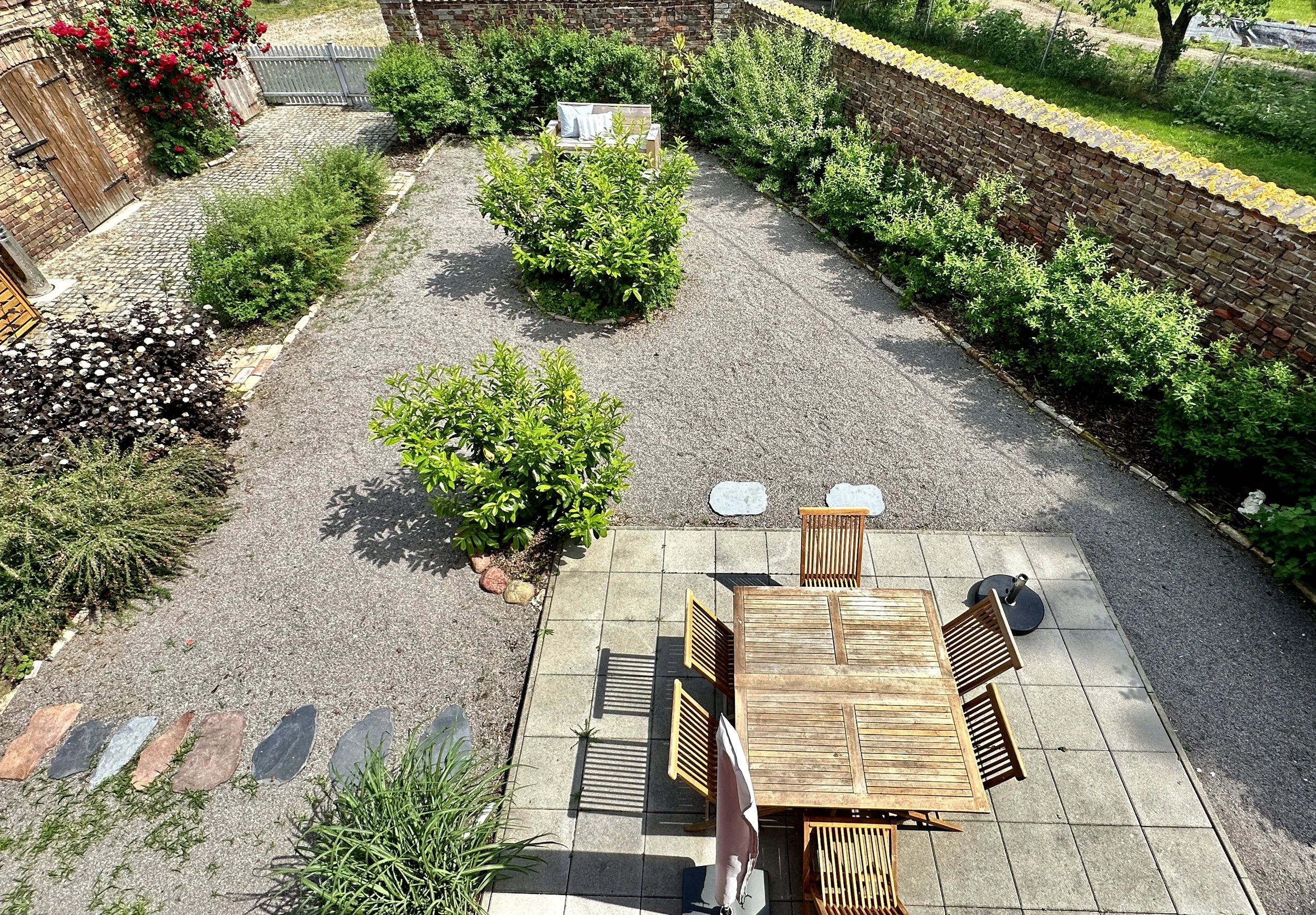 Blaue Haus mit Strohdach, umgeben von Grün und einem großen Baum, unter klarem blauen Himmel.