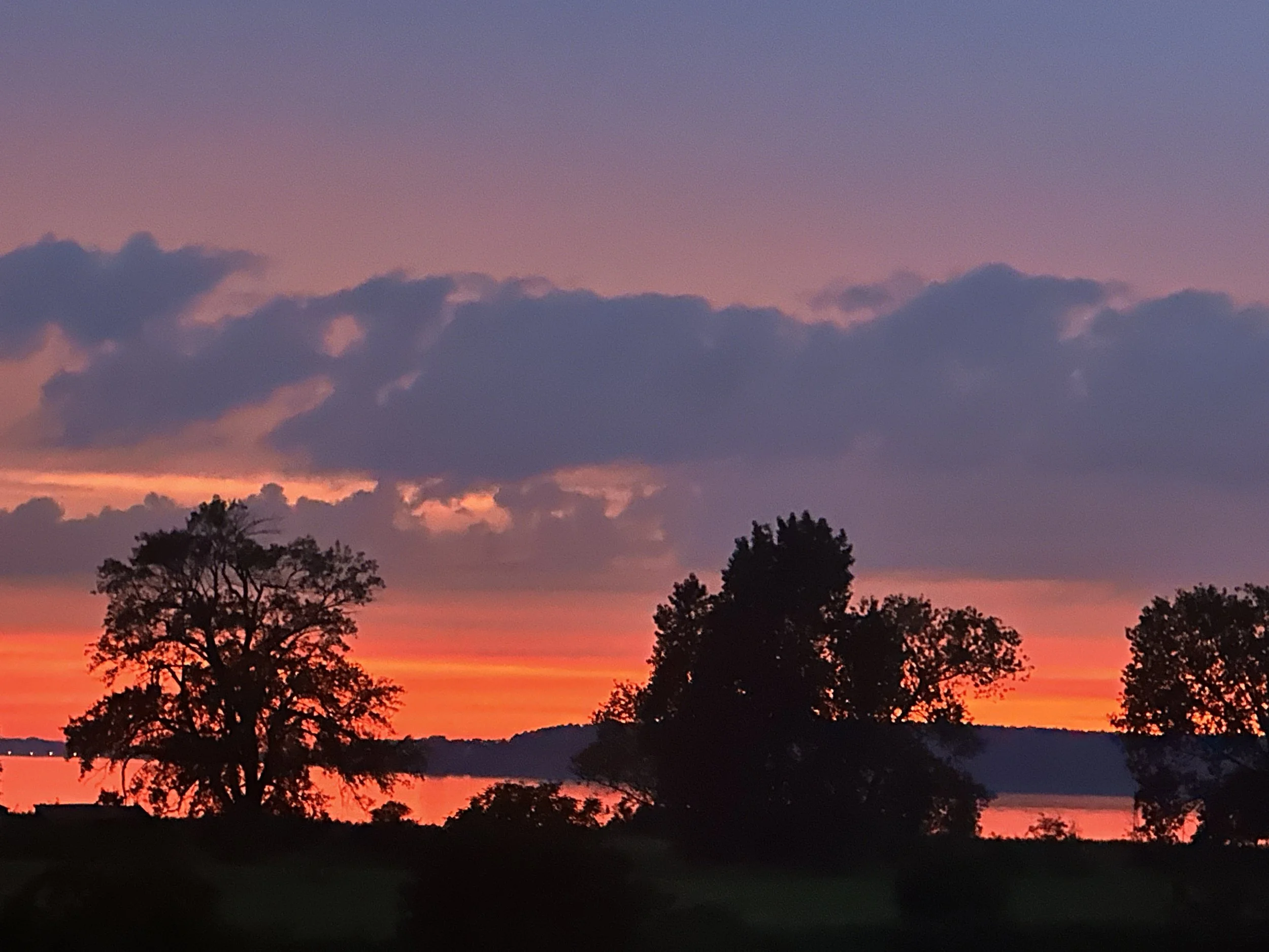 Sonnenuntergang über einem Fluss mit einem Segelschiff im Hintergrund und einem großen Felsen im Wasser im Vordergrund.
